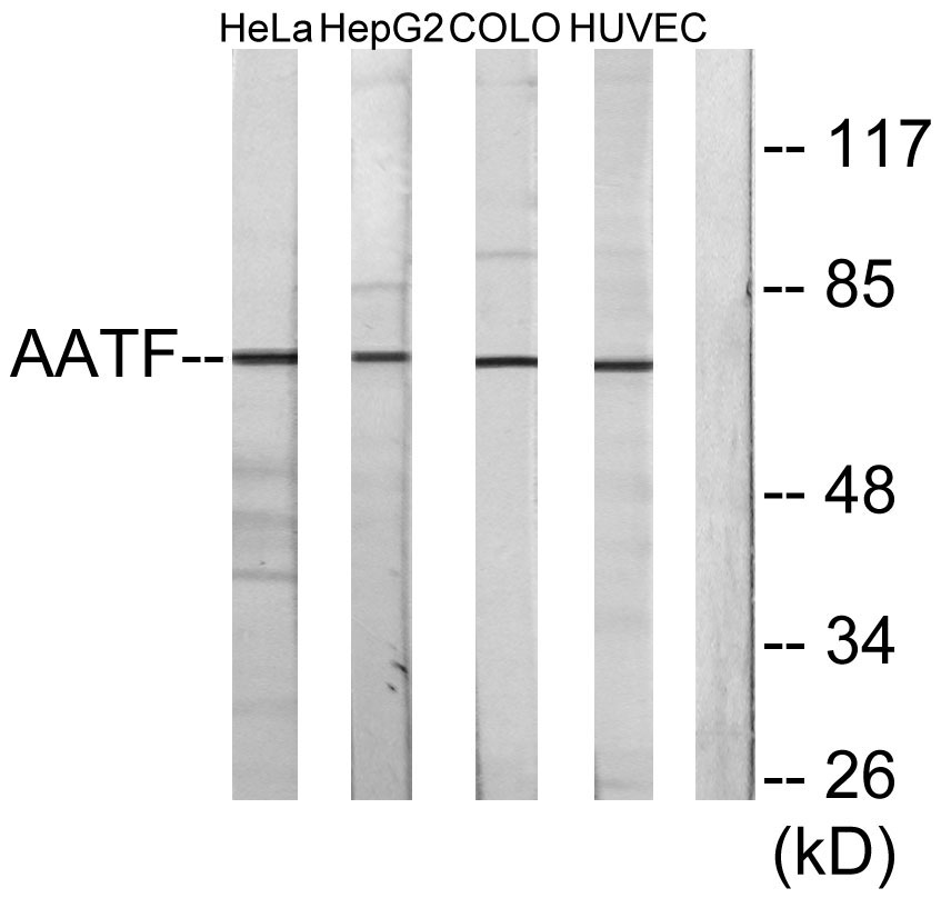 | Alternative Antibody Names | Anti-Protein Aatf antibodyAnti-Apoptosis-Antagonizing Transcription Factor antibodyAnti-Rb-Binding Protein Che-1 antibodyAnti-AATF antibodyAnti-CHE1 antibodyAnti-DED antibodyAnti-HSPC277 antibody |