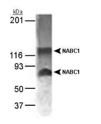 | Specificity: | Reacts with the C-terminal region of human NABC1. NABC1 is a 60 kDa protein; however it forms dimers, which are easliy detected in MCF-7 cells. |