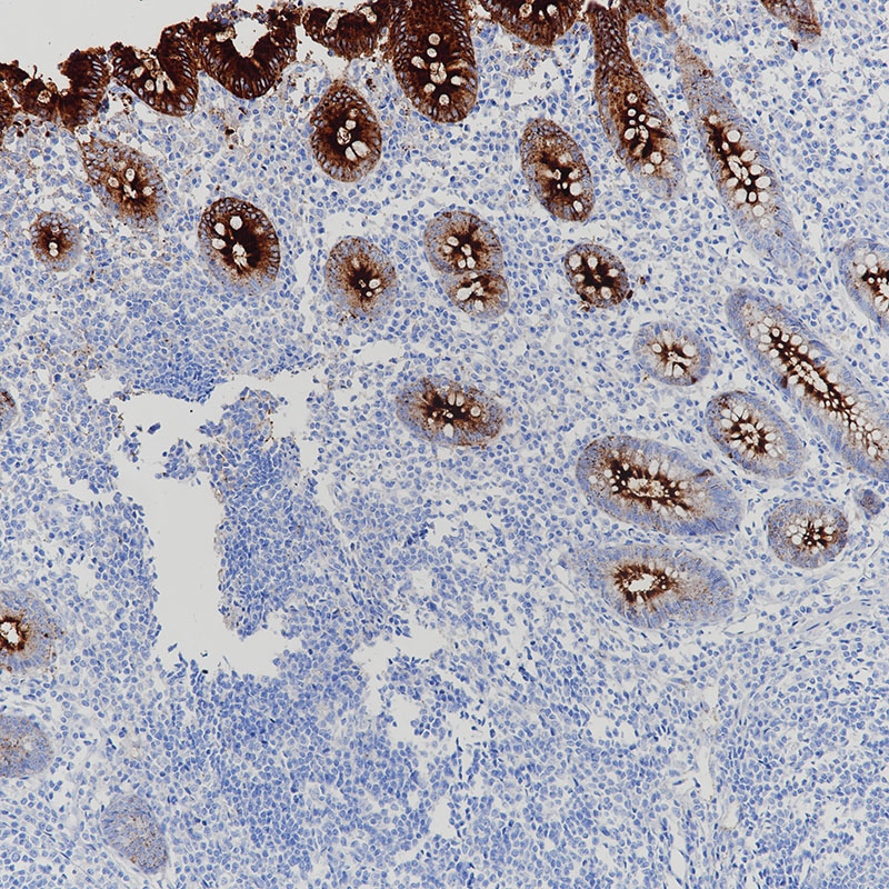 | Tissue Specificity | Expressed in columnar epithelial and goblet cells of the colon (at protein level). Found in adenocarcinomas of endodermally derived digestive system epithelium and fetal colon. |