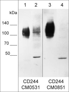 Specificity:Clone M085 mouse monoclonal antibody detects a 110 kDa* protein on SDS-PAGE Native" immunoblots of human THP1 monocytes. The antibody detects only the native CD244 protein, and the aldehyde-fixed CD244 protein. The antibody works for native western b