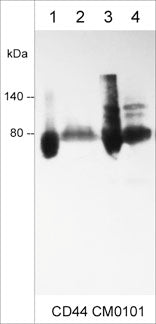 Specificity:Clone M010 detects 80-130 kDa* bands corresponding to the molecular mass of CD44 on SDS-PAGE immunoblots of native and denaturing human MDA-MB-231, A549, and A431 cell lysates. The antibody can be used for multiple applications including ELISA, weste