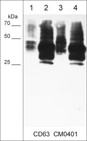 Specificity:Clone M040 mouse monoclonal antibody has high reactivity to CD63 at the plasma membrane in immunocytochemical assays, and weakly detects a 30-60 kDa* protein on SDS-PAGE Native" immunoblots of human A431, MeWo, and A549 cells. The antibody does not d