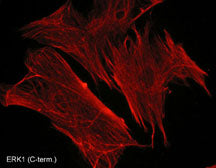 | Specificity: | The antibody detects a 44 kDa* protein corresponding to ERK1 on SDS-PAGE immunoblots of human A431 epithelial cells. It does not detect ERK2. |