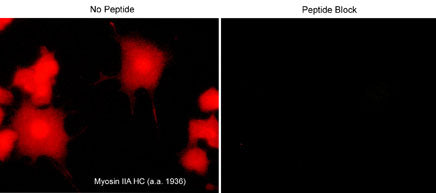 Immunogen:NMHC-IIA synthetic peptide (coupled to KLH) corresponding to amino acid residues in the C-terminal region of human myosin IIA heavy chain. This peptide sequence is highly conserved in rat and mouse NMHC-IIA, but is not found in NMHC-IIB and is not we