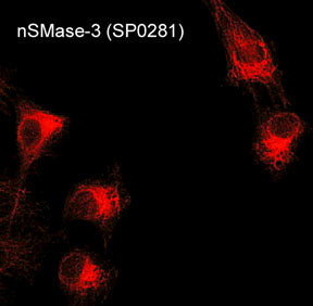 | Immunogen: | nSMase3 synthetic peptide corresponds to amino acids in the C-terminal region of mouse nSMase3. This sequence is highly conserved in rat and human nSMase3, and has low homology to other nSMase family members. |