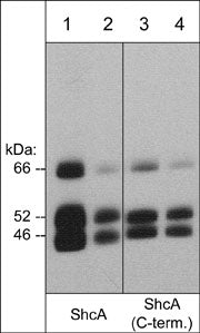 | Specificity: | The antibody detects 46/52/66 kDa* bands corresponding to the molecular weight of ShcA variants on SDS-PAGE immunoblots of A431 cells. It also detects ShcA in human Jurkat, HeLa, and SKN-SH cells, as well as rat brain tissue and rabbit spleen fibrobl |
