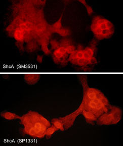 | Immunogen: | A recombinant protein that included amino acid residues within the C-terminal region of human ShcA. This sequence has high homology with similar regions in rat and mouse ShcA. |