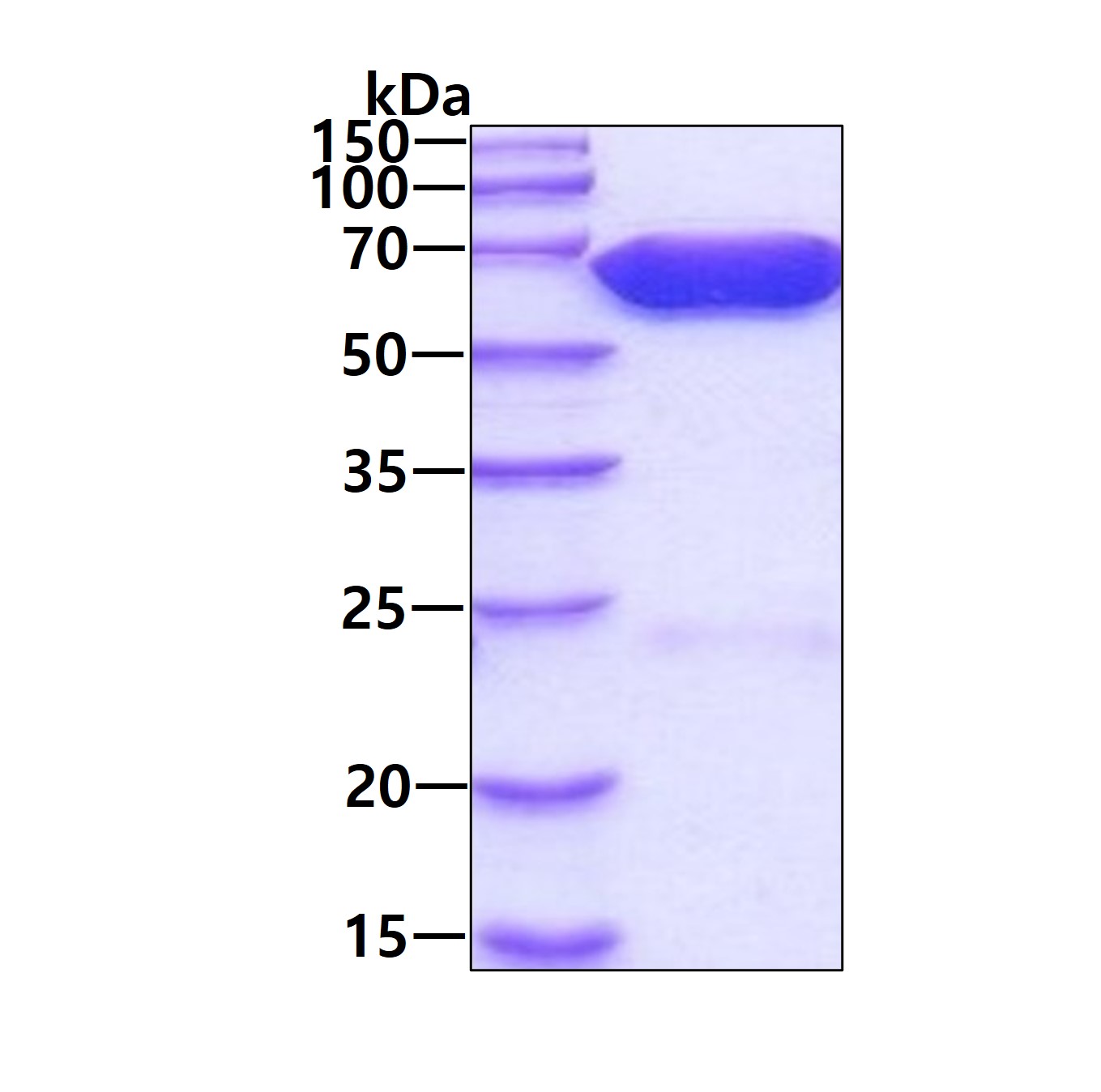 | Background | Luciferase is a generic term for the class of oxidative enzymes used in bioluminescence and is distinct from a photoprotein. Luciferase catalyzes a bioluminescent reaction which requires the substrate luciferin as well as Mg2+ and ATP, produces green light with a wavelength of 562 nm. Luciferase from firefly is widely used as a reporter for studying gene regulation and function, and for pharmaceutical screening. Recombinant firefly Luciferase, fused to His-tag at N-terminus, was expressed in E. coli and purified by using conventional chromatography techniques. |
